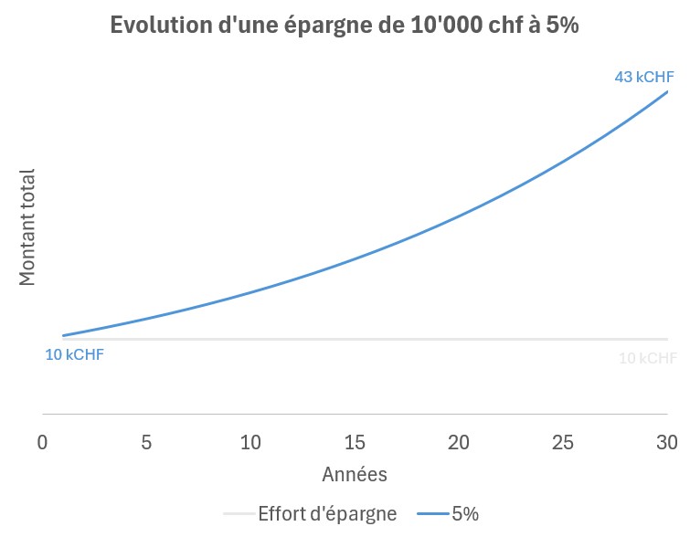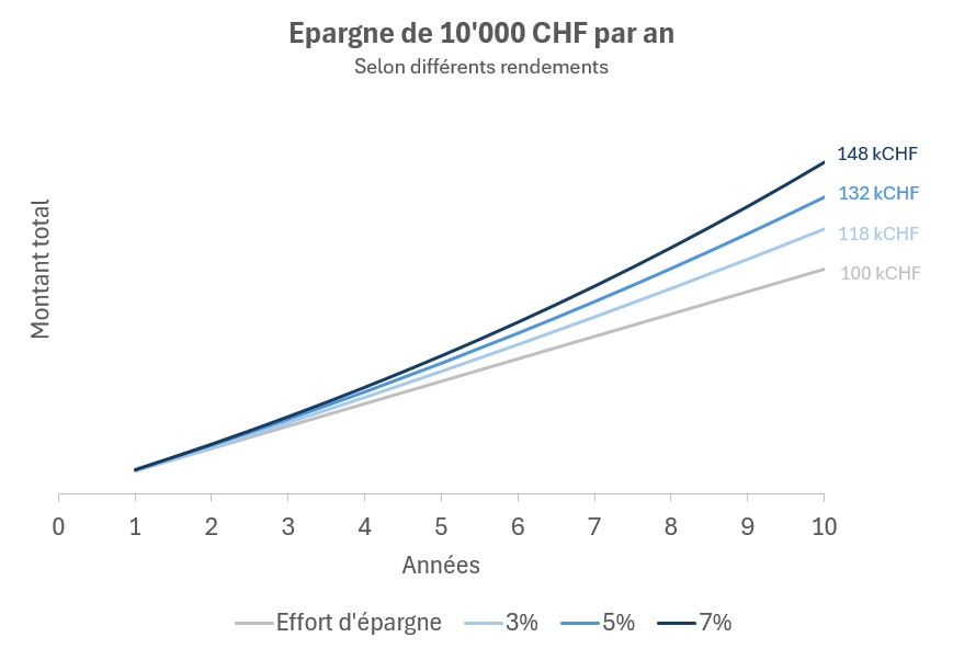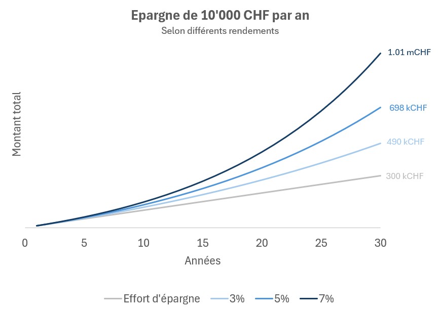 Supposons que l’on investisse 10’000 CHF d’épargne tous les ans pendant 30 ans.