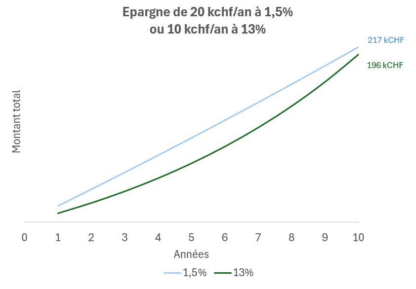Dans l’exemple extrême ci-dessous, sur les 10 premières années, un particulier qui épargne deux fois moins mais vise un rendement très ambitieux de 13 %, en prenant beaucoup plus de risques, atteindra à peine un montant similaire à celui d’une personne qui épargne deux fois plus sur un compte d’épargne sécurisé à 1,5 %.